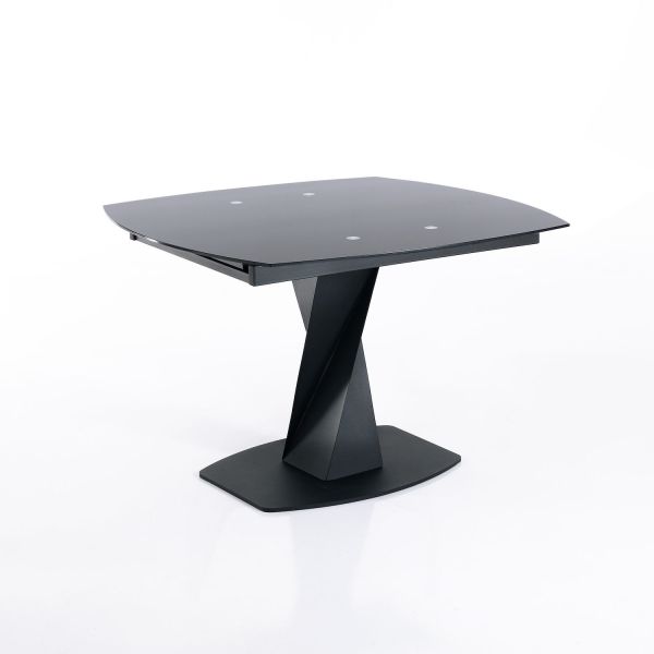 Il tavolo da cucina allungabile Bernat si distingue per l'eleganza della sua gamba centrale in acciaio verniciato nero opaco e per il piano in vetro temperato nero di spessore 8 mm. Il sistema di allunghe è molto pratico e veloce e queste sono posizionate sotto il top del tavolo.