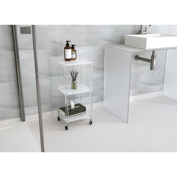 Il carrello Matilde è un complemento d’arredo elegante, compatto e multifunzionale, ideale per la cucina, il bagno o la zona living. Realizzato in plexiglass (PMMA), presenta una struttura in aste rotonde Ø 18 mm disponibili solo trasparenti, e vassoi da 5 mm in quattro finiture: trasparente, bianco, nero e fumé grigio.