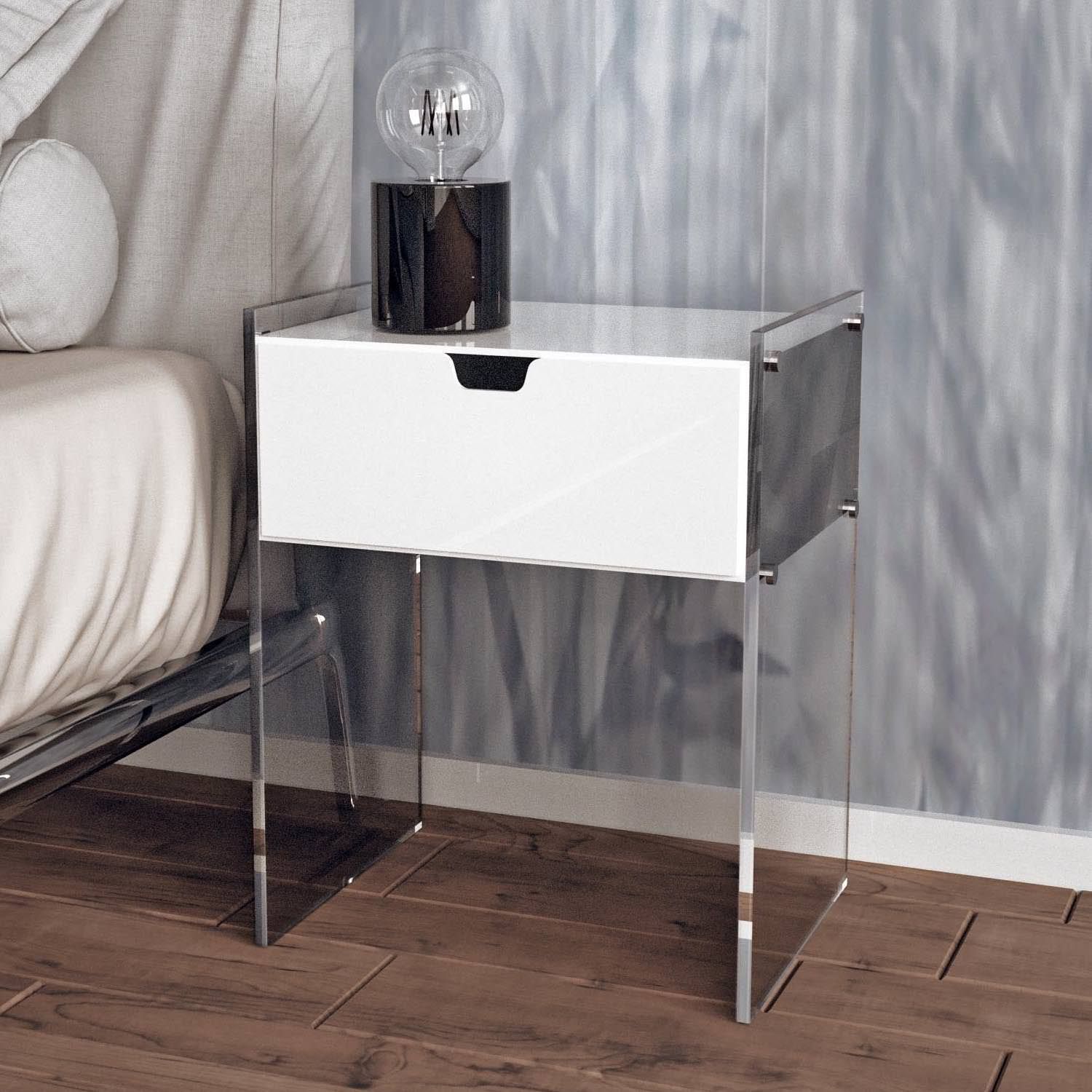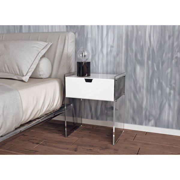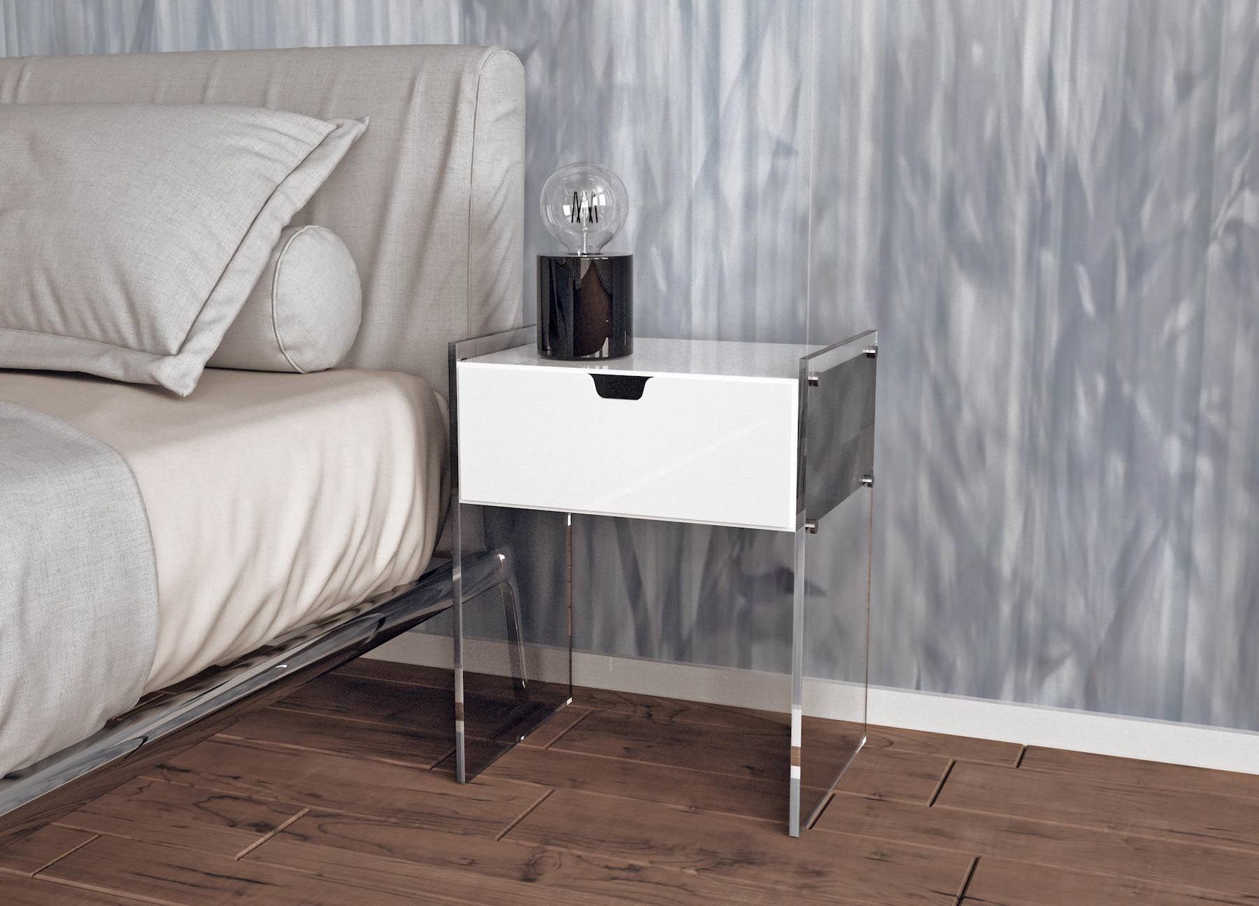 Le dimensioni L40xP30xH50 cm lo rendono pratico, compatto e perfetto come comodino, piccolo mobile contenitore, piano d'appoggio o punto luce accanto al letto. Il cassetto scorrevole offre spazio prezioso per riporre oggetti personali, mentre la struttura in plexiglass garantisce facile manutenzione e una sorprendente solidità.