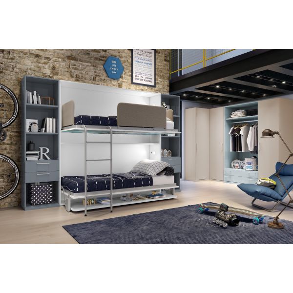 Cerchi un letto a castello a scomparsa per ottimizzare gli spazi nella camera dei bimbi? Oppure per arredare una casa vacanze al mare o in montagna? Express è un letto a castello a scomparsa, con apertura orizzontale, dallo stile unico ed inconfondibile. Fa parte di un programma di letti a scomparsa prodotti al 100% da azienda italiana, specializzata nella produzione di mobili salvaspazio e trasformabili. Su richiesta al letto possono essere aggiunti scaffali, librerie, scrivanie, pensili con anta ed armadi della stessa linea.