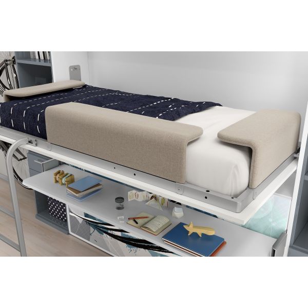 Gli schienali di serie sono in melaminico bianco. Scaletta e protezione letto superiore (fissa non reclinabile) comprese nel prezzo. Non sono inclusi mobili laterali (librerie), la scrivania a scomparsa, la stampa digitale sui frontali, i materassi, le testatine reclinabili.