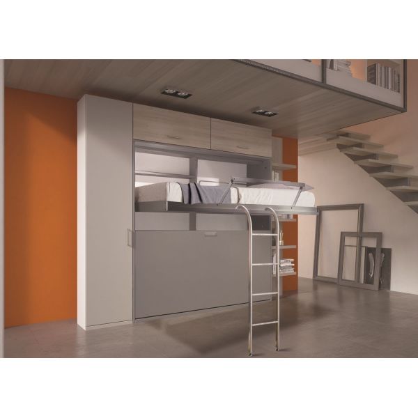 Il sistema permette l'apertura dei 2 letti contemporaneamente o indipendentemente, la scaletta ha funzione di sostegno ed è posizionata frontalmente al centro