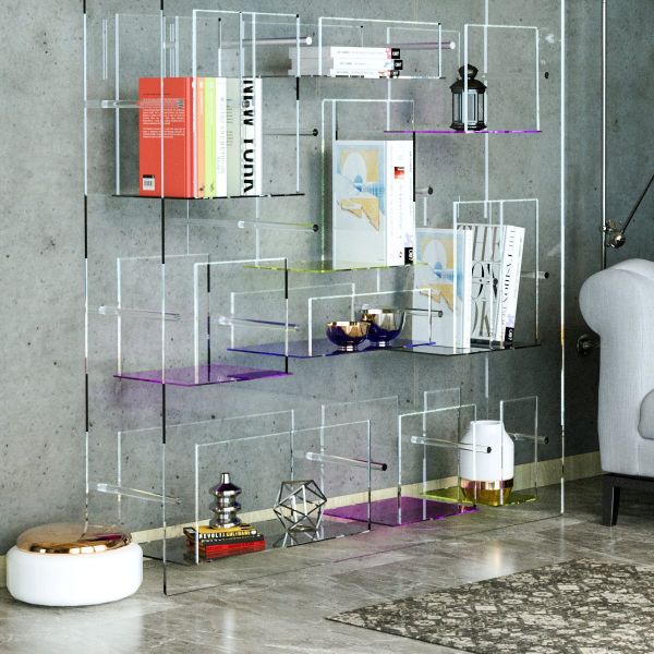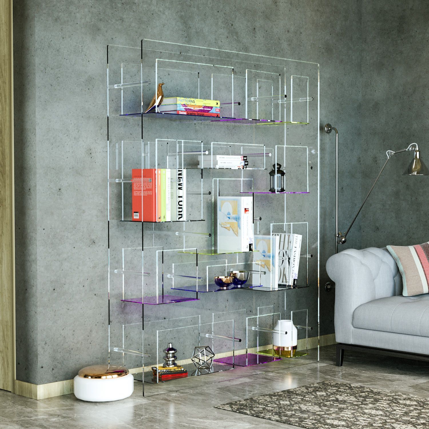 Elemento distintivo del modello Jemma sono i ripiani multicolor in PMMA da 5 mm, che introducono un gioco di tonalità vivaci e raffinate. Questi dettagli cromatici non solo esaltano la trasparenza della struttura, ma trasformano la libreria in un vero e proprio oggetto di design, capace di catturare l’attenzione e personalizzare con creatività qualsiasi stanza.