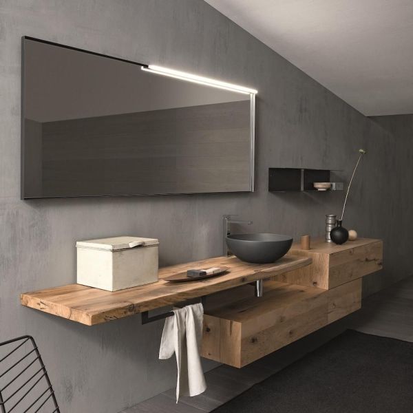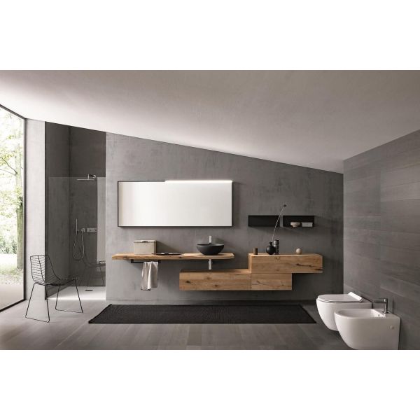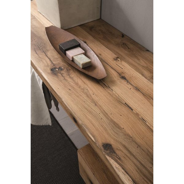 Sviluppata utilizzando sia per i frontali (ante o cassetti) che per la struttura il vero legno di Rovere o Abete (declinato nelle versioni Nero, Invecchiato, Naturale e Bianco), interpreta il design rivestendo la stanza da bagno con materiali prestigiosi.