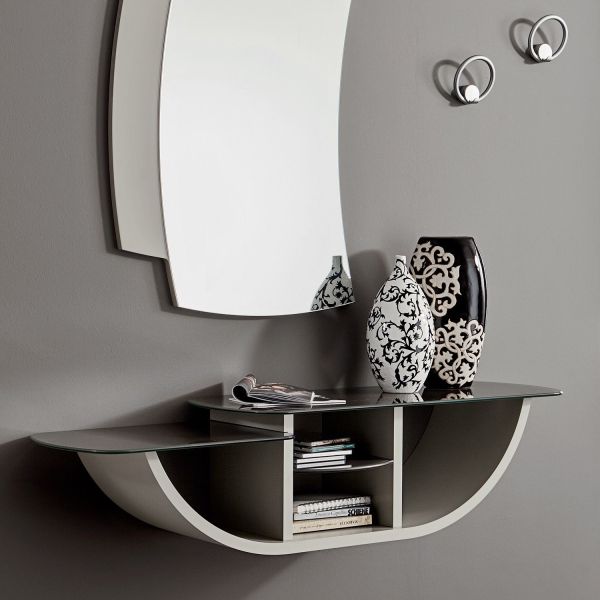 L'ingresso è il biglietto da visita della casa, quindi quale miglior modo per renderlo inconfondibile se non grazie a questa moderna composizione di mobili da ingresso? Consolle da parete in MDF laccato Ecru opaco, top in vetro Moka; specchio in finitura Ecru opaco, attaccapanni da muro in metallo. Realizzata completamente da azienda italiana. Dimensioni (larghezza x profondità x altezza): Consolle L121,5 x H29 x P34 cm, Specchiera L60 x H85,5 cm.