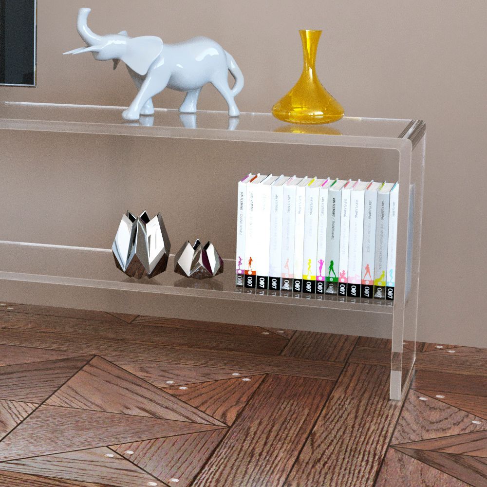 Il Mobile TV in plexiglass Brooklyn 200 rappresenta un perfetto equilibrio tra design moderno, funzionalità e raffinatezza estetica. Realizzato interamente in PMMA trasparente di alta qualità, si distingue per la struttura a ponte dalle linee pulite e minimali, capace di valorizzare qualsiasi ambiente con un tocco di leggerezza e luminosità. La struttura principale, con spessore di 20 mm, garantisce robustezza e stabilità, mentre i ripiani in plexiglass da 15 mm offrono ampio spazio per accogliere decoder, console, impianti audio o altri dispositivi multimediali. Le aste cilindriche centrali Ø30 mm non solo aggiungono solidità alla composizione, ma contribuiscono a creare un raffinato effetto visivo di equilibrio e trasparenza.