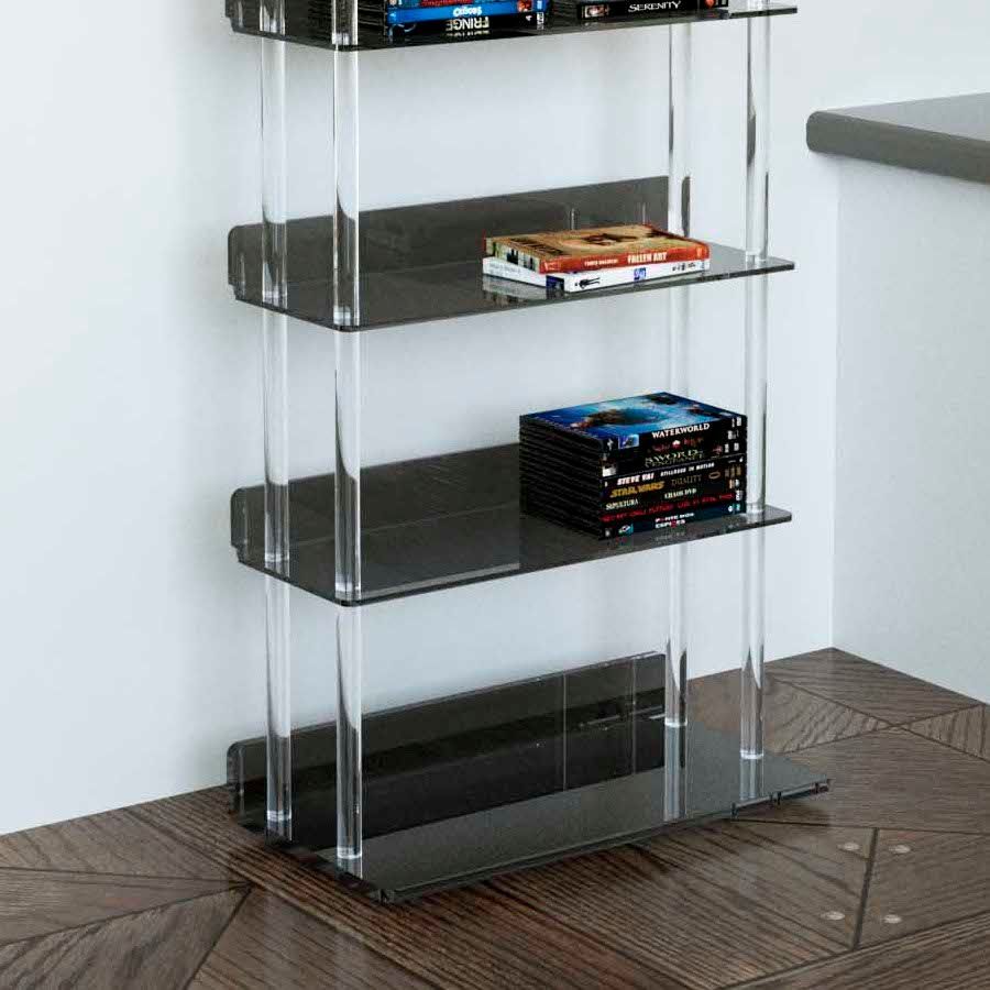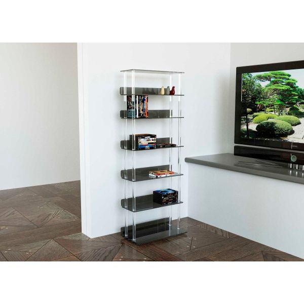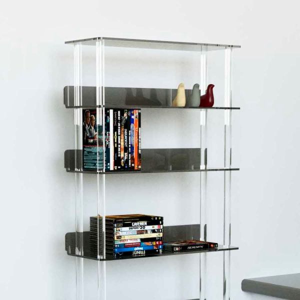 La struttura è composta da una base spessa 10 mm, solida e stabile, e da ripiani da 5 mm che creano un effetto di sospensione e trasparenza. Il tutto è sostenuto da aste cilindriche Ø18 mm, disponibili solo in versione trasparente, che donano alla struttura un aspetto armonioso e lineare. I ripiani sono personalizzabili in quattro eleganti finiture — trasparente, bianco, nero o fumé grigio — per adattarsi perfettamente a qualsiasi stile d’arredo, dal minimal chic al contemporaneo.