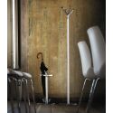 Piantana in tubolare d’acciaio Ø 32 mm, fissata alla base mediante vite M8 in acciaio zincato, verniciata con polveri epossidiche colori nero bucciato, grigio argento o bianco opaco. Anello portaombrelli realizzato in alluminio pressofuso lucidato, completato da una maniglia realizzata anch’essa in alluminio pressofuso lucidato, assemblati al montante mediante vite M8 in acciaio zincato. Vaschetta raccogligocce in policarbonato traslucido.