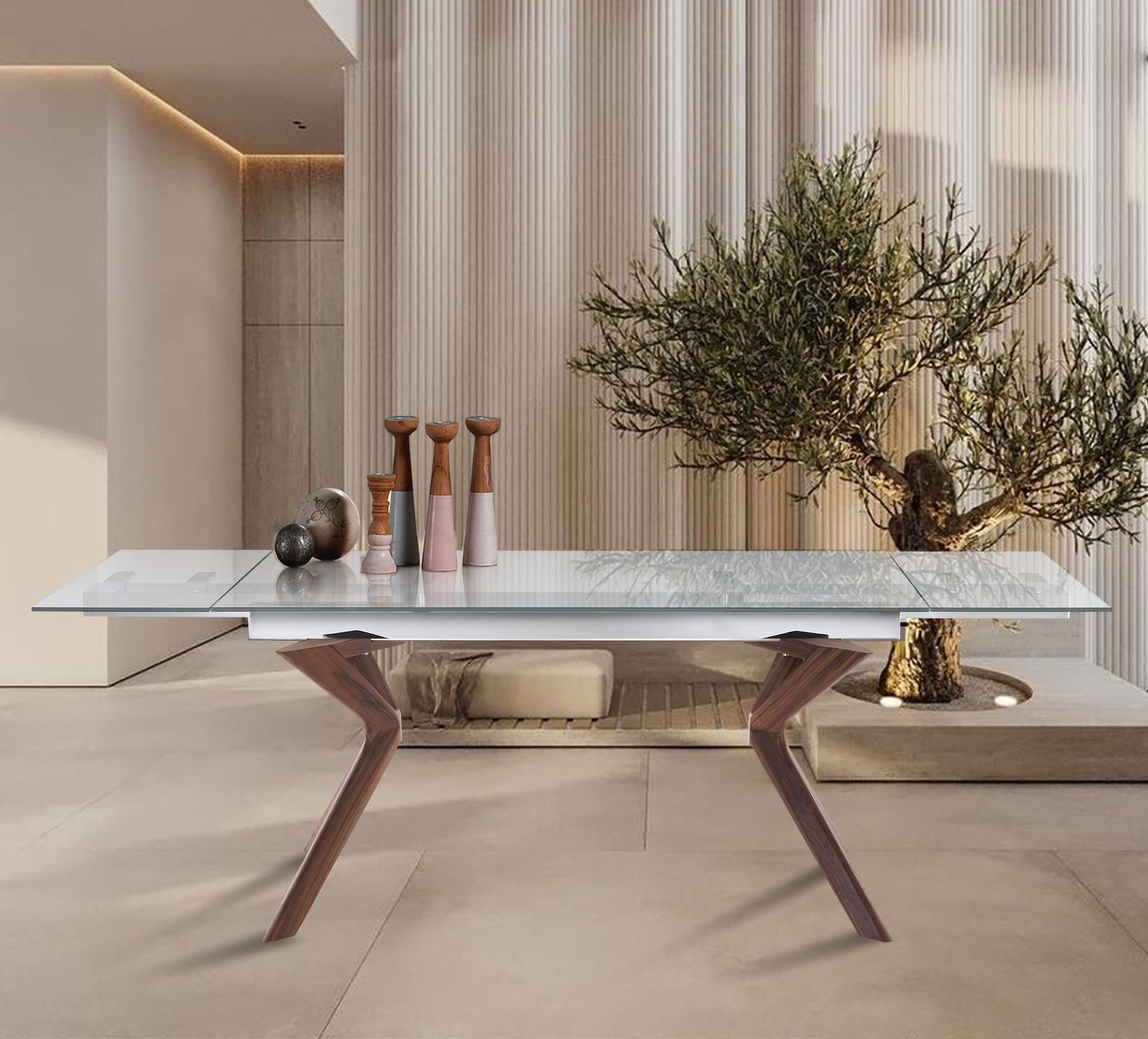 Ecco il tavolo allungabile Garet, costituito da un'elegante base in legno massello ed un raffinato piano allungabile in vetro temperato.