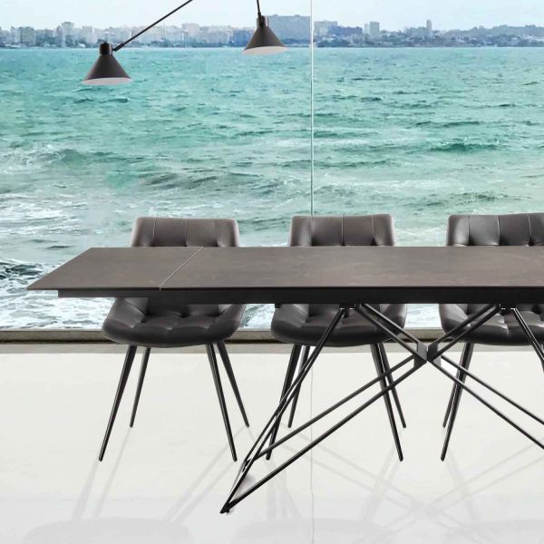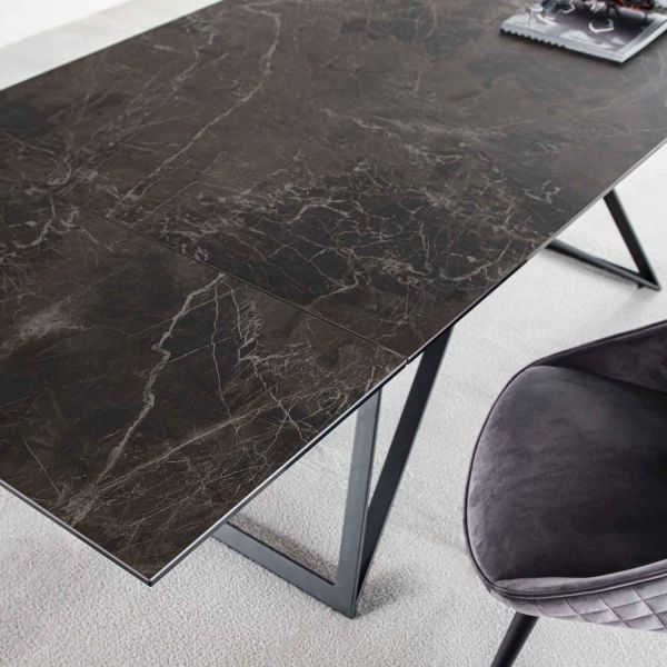 Dalma è un tavolo da pranzo allungabile con piano di forma rettangolare (160x90 cm), che è anche un raffinato e moderno oggetto di design, in grado di donare stile e classe alla tua zona living. Realizzato con una solida base in acciaio verniciato nero ed un piano superiore in vetro ceramica nella finitura Grafite Brown. Le venature variano da piano a piano, inoltre quelle del piano possono non coincidere con quelle delle allunghe.